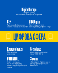 Україна вже доєдналась до ключової програми ЄС “Цифрова Європа” до 2027 року, що передбачає чотири ключові напрямки для отримання підтримки: високопродуктивний комп’ютинг; штучний інтелект, дані та хмарні послуги; цифрові навички; використання цифрових технологій в економіці та суспільстві.